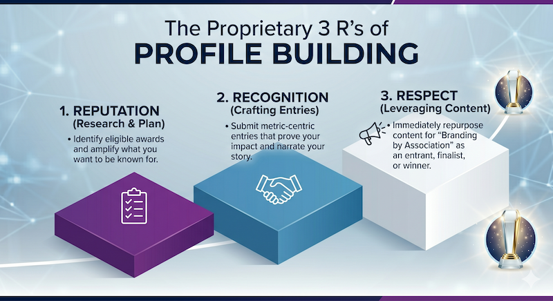 The 3 R's is a proprietary strategic process consisting of Reputation, Recognition, and Respect. It begins by identifying why you want to build your reputation, followed by submitting compelling entries for recognition, and finally leveraging that content to earn long-term respect and industry authority.